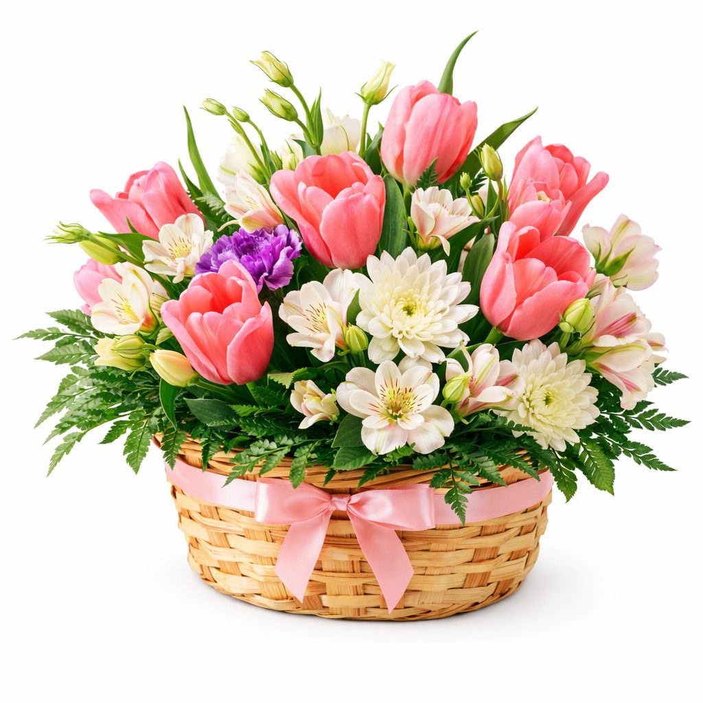 Этот букет из розовых тюльпанов, белых кустовых хризантем, белых альстромерий и фиолетовых гвоздик с зеленью создаёт радостное настроение. Цветы помещены в плетёную корзину, что добавляет композиции естественности и очарования. Атмосфера свежести и гармонии идеально подойдёт для романтического вечера или свидания. Прекрасный подарок для любимой женщины на День Святого Валентина.