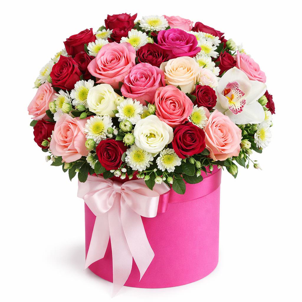 Нежные розовые и бордовые оттенки роз, вместе с белыми орхидеями и хризантемами, создают атмосферу гармонии и спокойствия. В композиции представлены: одноголовая розовая роза, кустовая бордовая роза, белая орхидея, белая кустовая хризантема и гипсофила. Букет аккуратно оформлен в элегантную шляпную коробку. Эта композиция подарит нежность на День Святого Валентина для вашей возлюбленной.