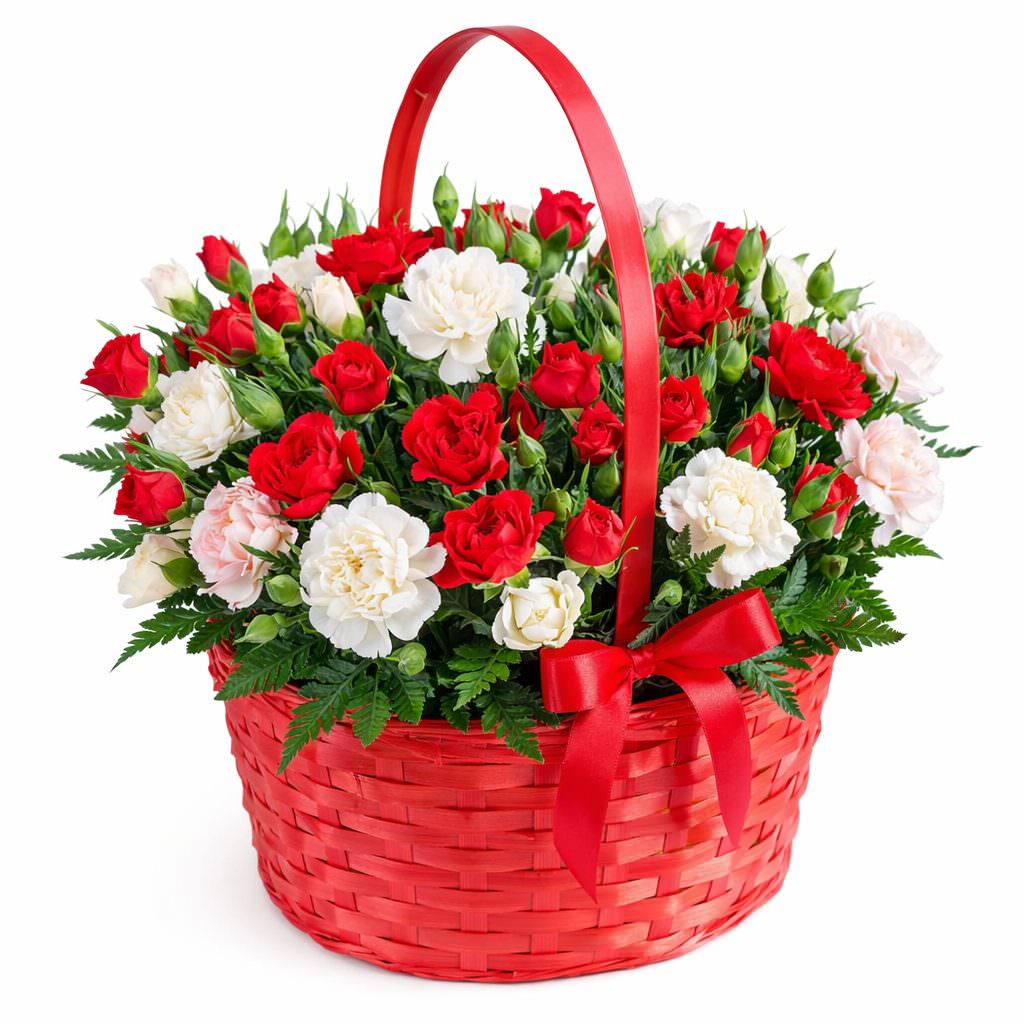 Эта композиция дарит ощущение радости и тепла благодаря ярким красным кустовым розам и нежным белым мини-гвоздикам. Цветы размещены в плетёной корзине с красной ручкой, создавая эффектный контраст и праздничное настроение. Композиция станет прекрасным украшением на День матери для любимой женщины. Идеально подходит для создания уютной атмосферы в доме или офисе.
