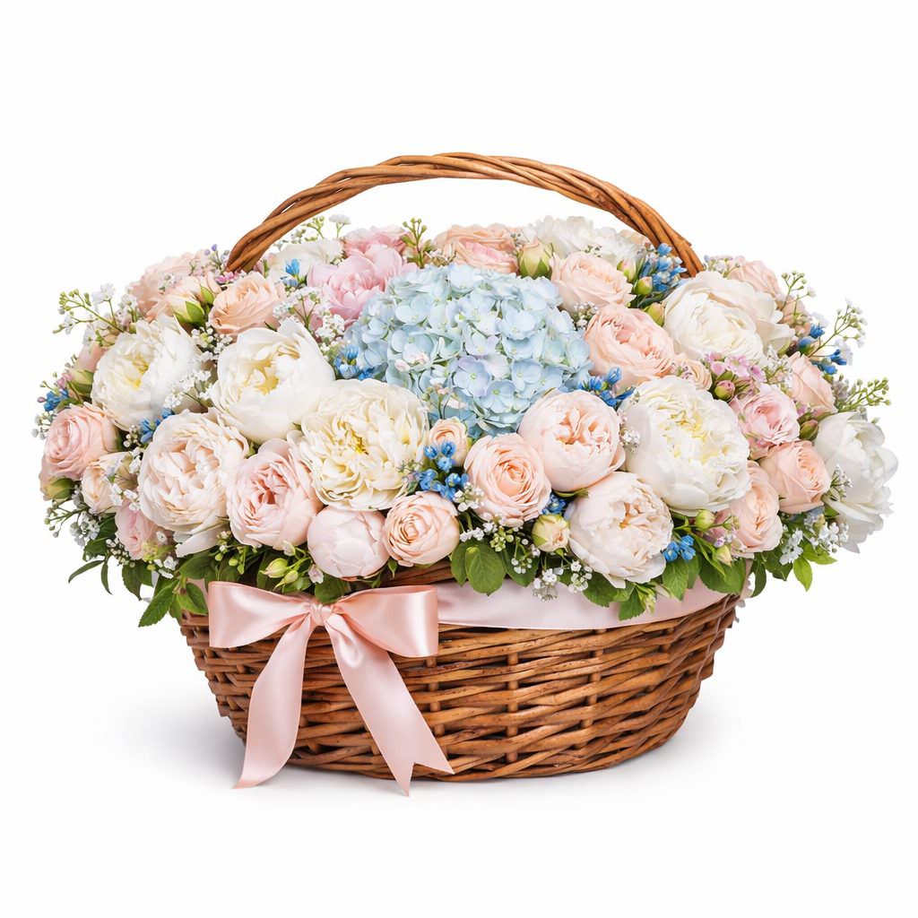 Эта композиция вызывает ощущение свежести и нежности благодаря сочетанию голубой и розовой гортензии, белых пионов, кремовых кустовых роз и белой маттиолы. Оксипеталум и ваксфлауэр добавляют изысканности, а зелень фисташки завершает образ. Композиция оформлена в плетёной корзине, что подчеркивает её природную красоту. Она создаёт атмосферу романтики и элегантности. Прекрасный подарок для любимой на годовщину.