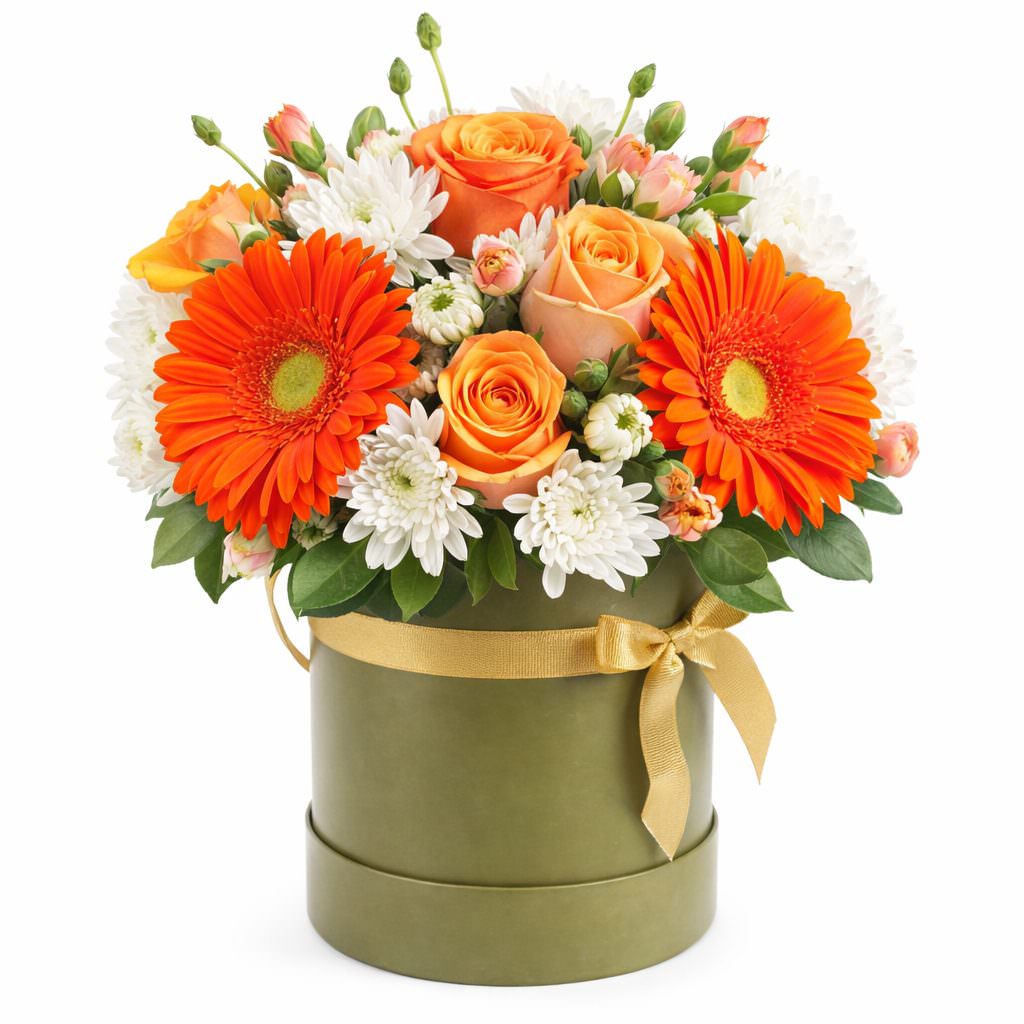 Эта композиция поражает сочностью оранжевых и белых оттенков. В составе оранжевая гербера, оранжевая кустовая роза, белая кустовая хризантема, мини розовая кустовая гвоздика и оранжевая одноголовая роза. Букет оформлен в стильной цилиндрической шляпной коробке зелёного цвета. Он создаёт атмосферу радости и подходит на День матери для подруги.
