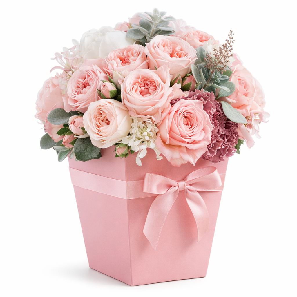 Эта композиция в розовых тонах подарит ощущение нежности и романтики. В состав входят пионовидные розы, одноголовые розы, белые пионы, бордовые гвоздики и суккуленты. Цветы аккуратно расположены в квадратной коробке нежно-розового цвета. Такой букет создаёт атмосферу изысканности и будет прекрасным подарком для любимой женщины на День Святого Валентина.